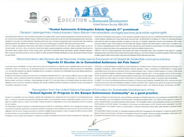 UNESCO reconoce al Pais vasco por el buen trabajo desarrollado en el proyecto Agenda 21 escolar y subraya el grado de excelencia logrado a través de las "Escuelas hacia la sostenibilidad" que han sido reconocidas y que son un ejemplo de proceso basado en la mejora continua.
