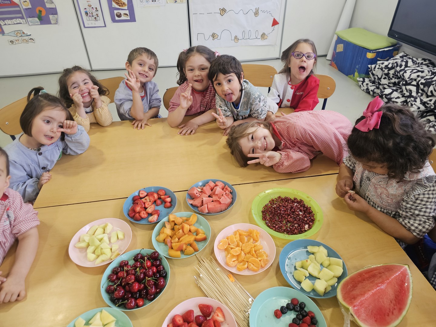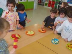 Garaiko frutarekin brotxeta koloretsuak prestatu eta dastatu ditugu gelan. Honela zapore desberdinak probatzeko aukera izan dugu. Denon artean mota desberdineko frutak bildu ditugu: meloia, okarana, anana, sandia.... Ohitura osasungarriak gogoratu ditugu, eskuak eta fruta garbitu eta gero fruta zuritzen eta zatitzen ikasi dugu. Saioa oso dibertigarria. Umm bai goxoa dena!